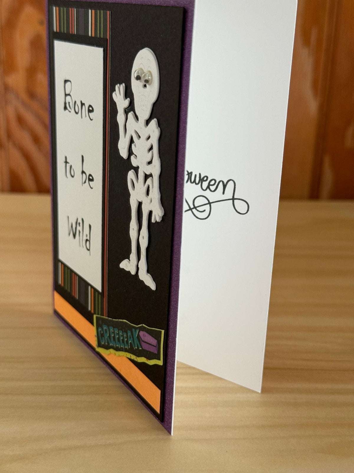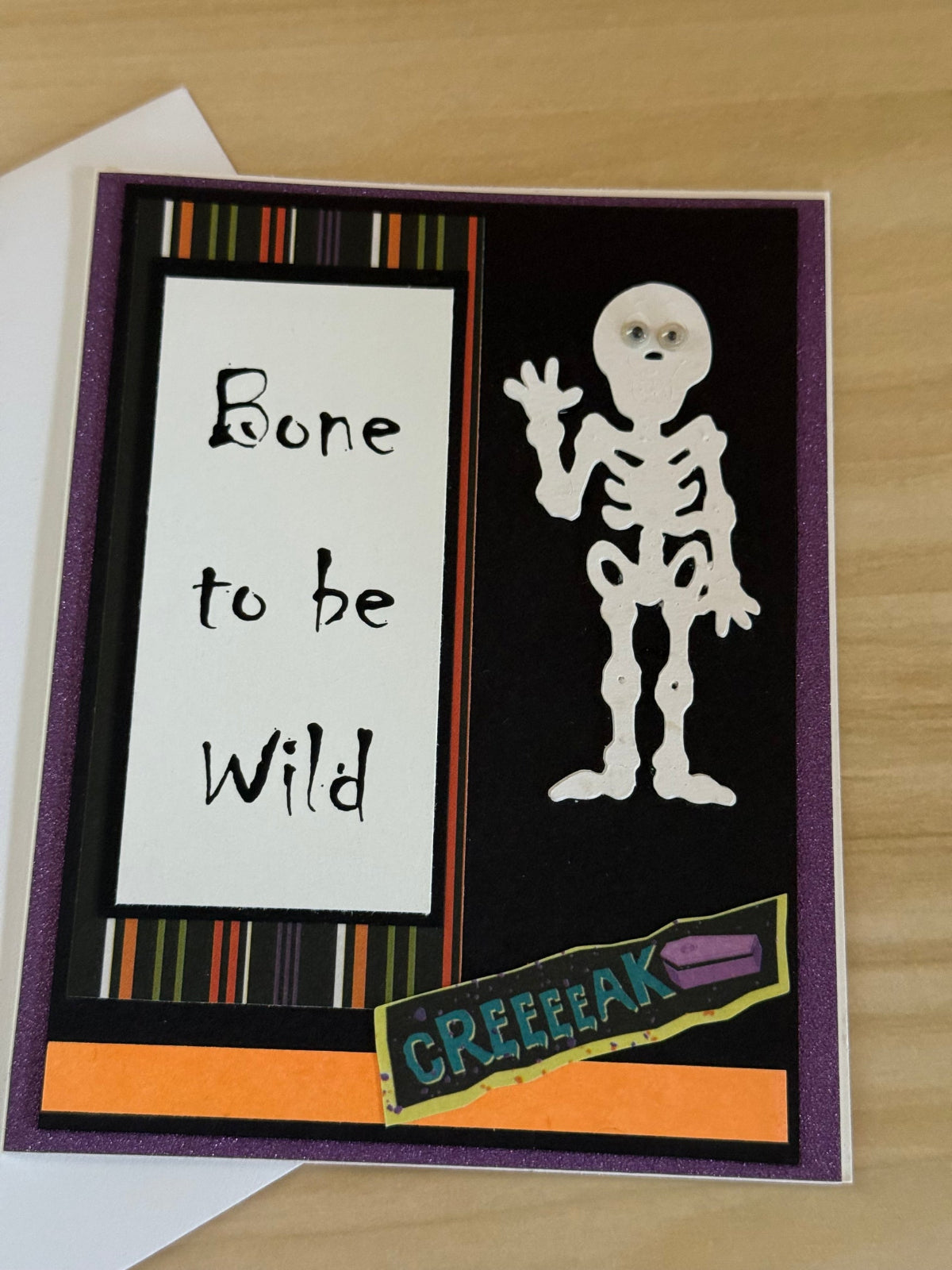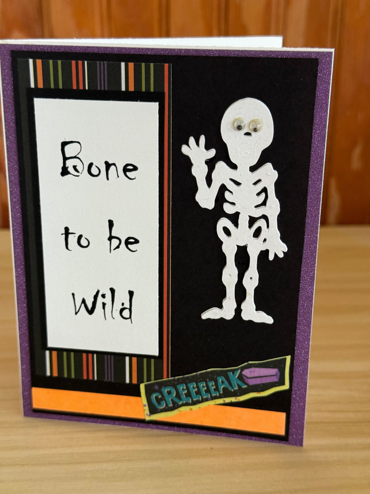 A playful handmade Halloween card with a funky, spooky twist! Featuring a cheerful white skeleton with googly eyes, framed beside the bold phrase “Bone to be Wild” in a fun, creepy font. Accented with a striped Halloween border, shimmering purple background, bright orange strip, and a glittery tag reading “CREEEEAK” with a friendly skeleton. Perfect for sending lighthearted fright-night fun to friends and family.