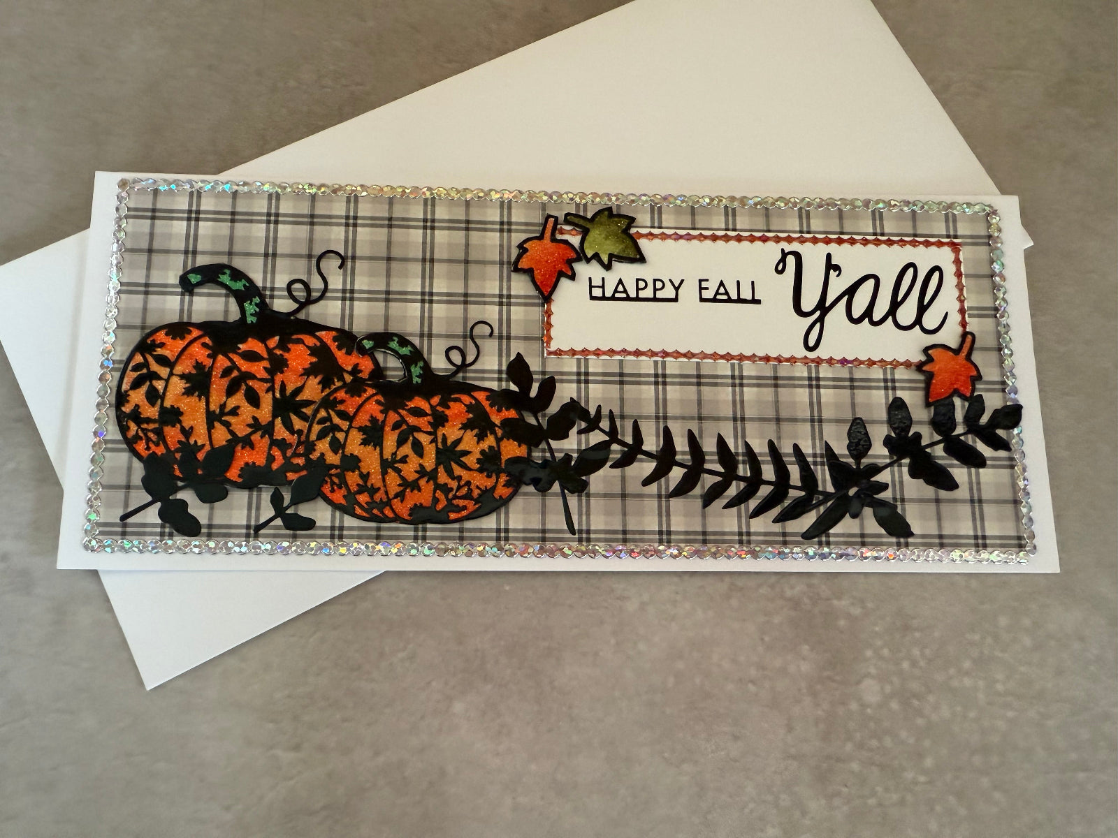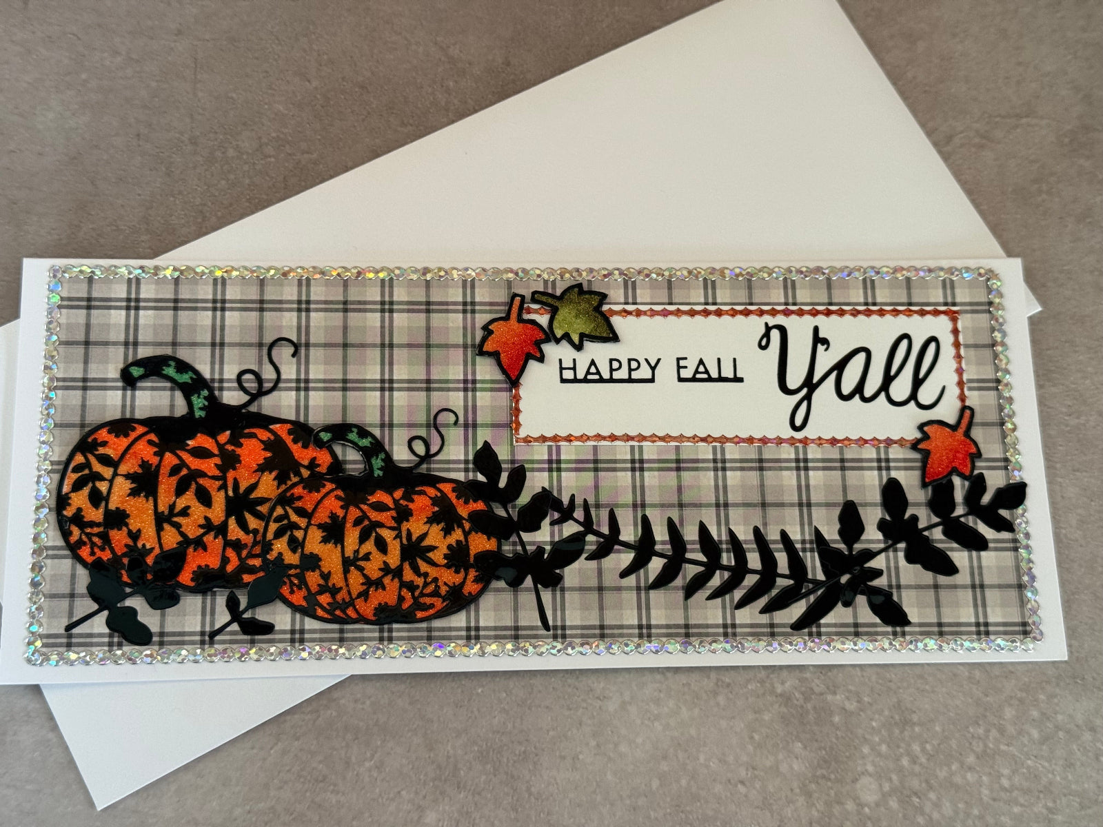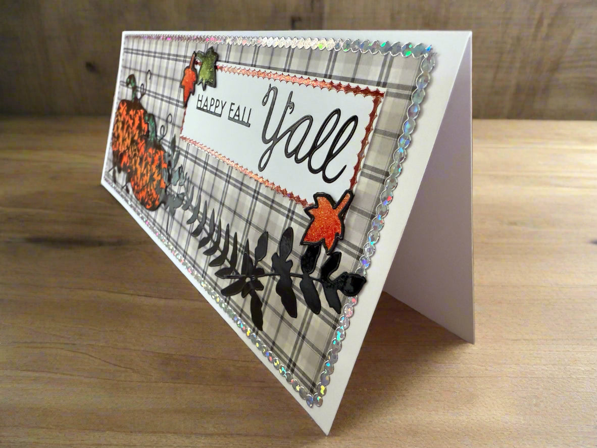 This handmade slimline card is full of festive autumn charm. Set against a soft plaid background, two glittering orange pumpkins with intricate leafy cutouts take center stage, accented by bold black foliage. The cheerful sentiment “Happy Fall Y’all” is framed with sparkling borders and topped with shimmering fall leaves in orange and green. Finished with a holographic sequin-style trim around the edges, this card is both rustic and elegant—perfect for celebrating the cozy spirit of fall with family and friends.