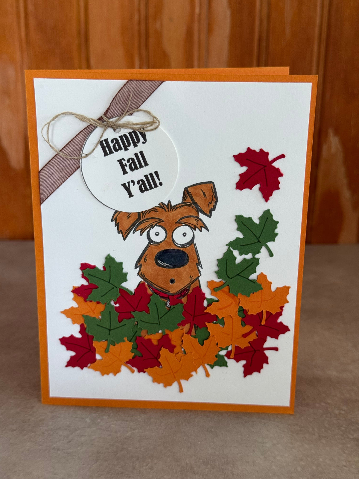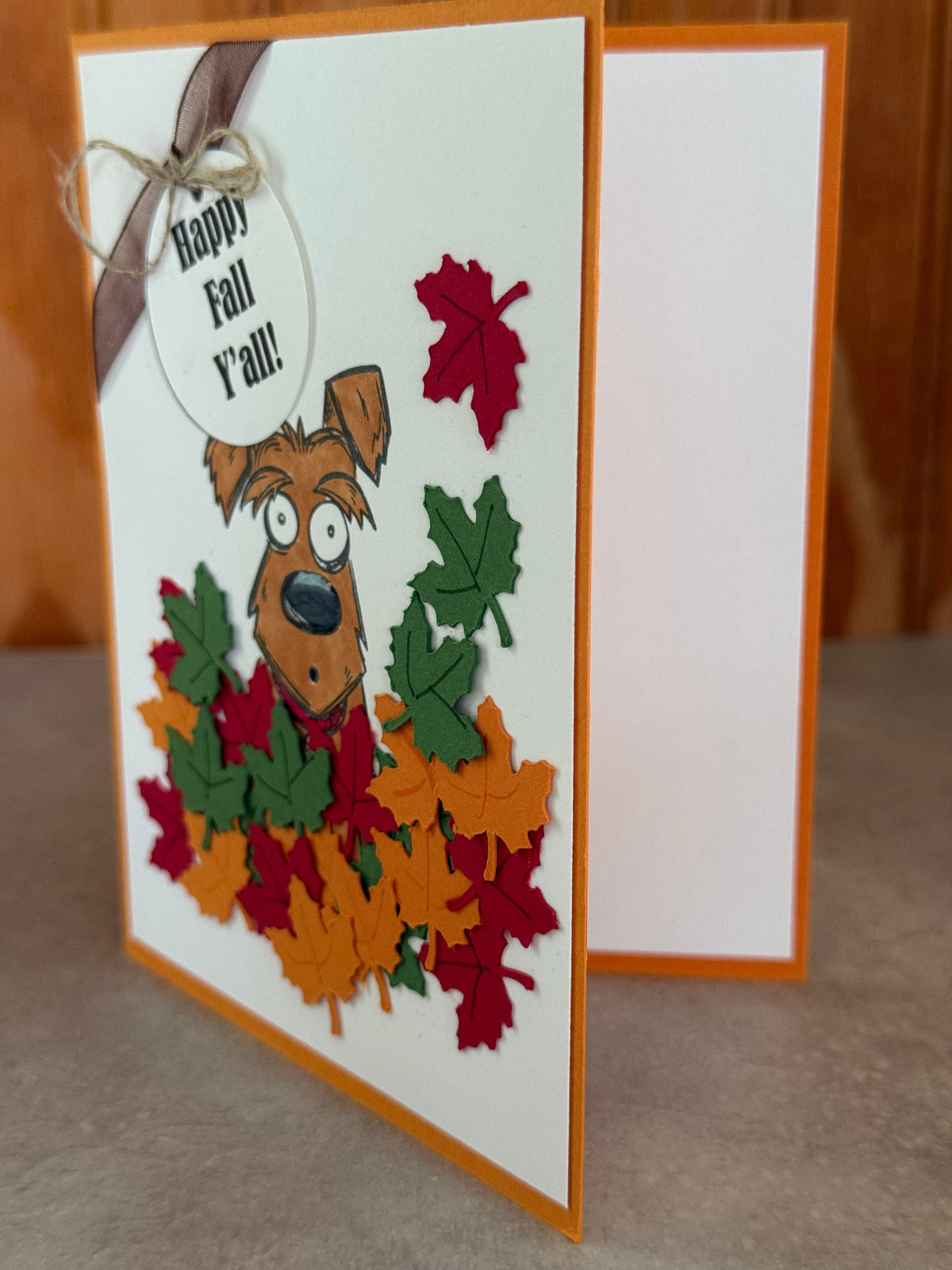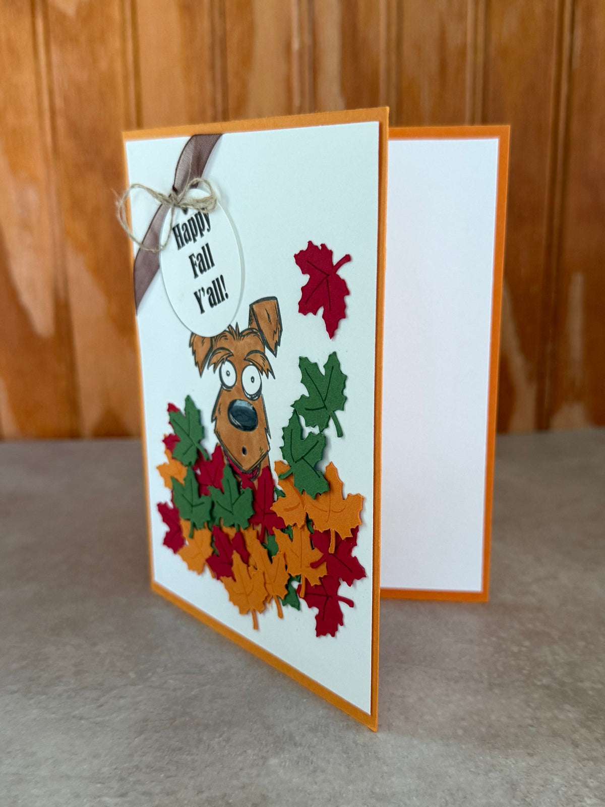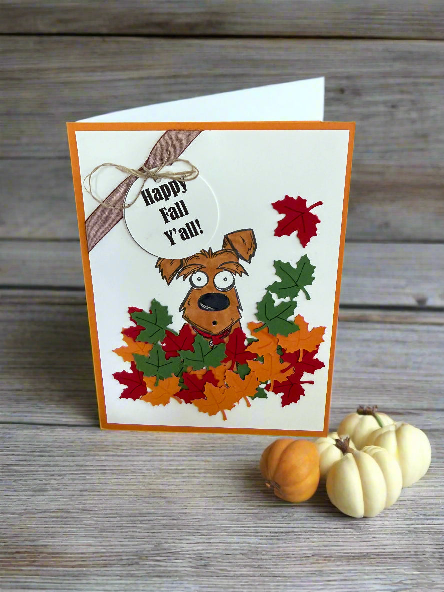 This handmade card brings autumn joy with a playful pup peeking out from a colorful pile of die-cut fall leaves in shades of orange, red, and green. The adorable dog illustration, wide-eyed with surprise, adds a touch of humor and warmth. A circular tag tied with ribbon and twine carries the festive sentiment βHappy Fall Yβall!β, making this card perfect for sending seasonal cheer to friends and family. With its bright colors and whimsical design, itβs sure to bring a smile to anyoneβs face this fall!