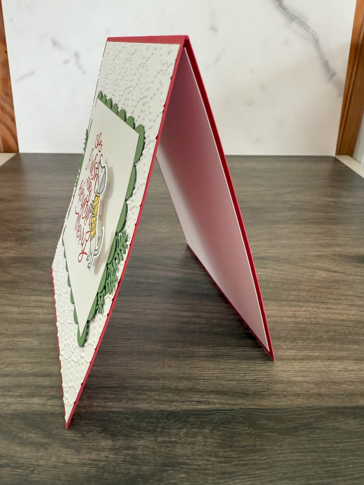 This handmade Christmas card delivers both charm and joy with its playful design. The sentiment βA Wish for Everything Merryβ is beautifully displayed in festive red script, framed with scalloped green edging, pine sprigs, and a delicate red bow. A sweet dachshund in a cozy yellow holiday sweater adds a heartwarming touch of whimsy. The embossed white background creates elegant texture, making this card a perfect way to share merry wishes with friends, family, or fellow dog lovers this holiday season.