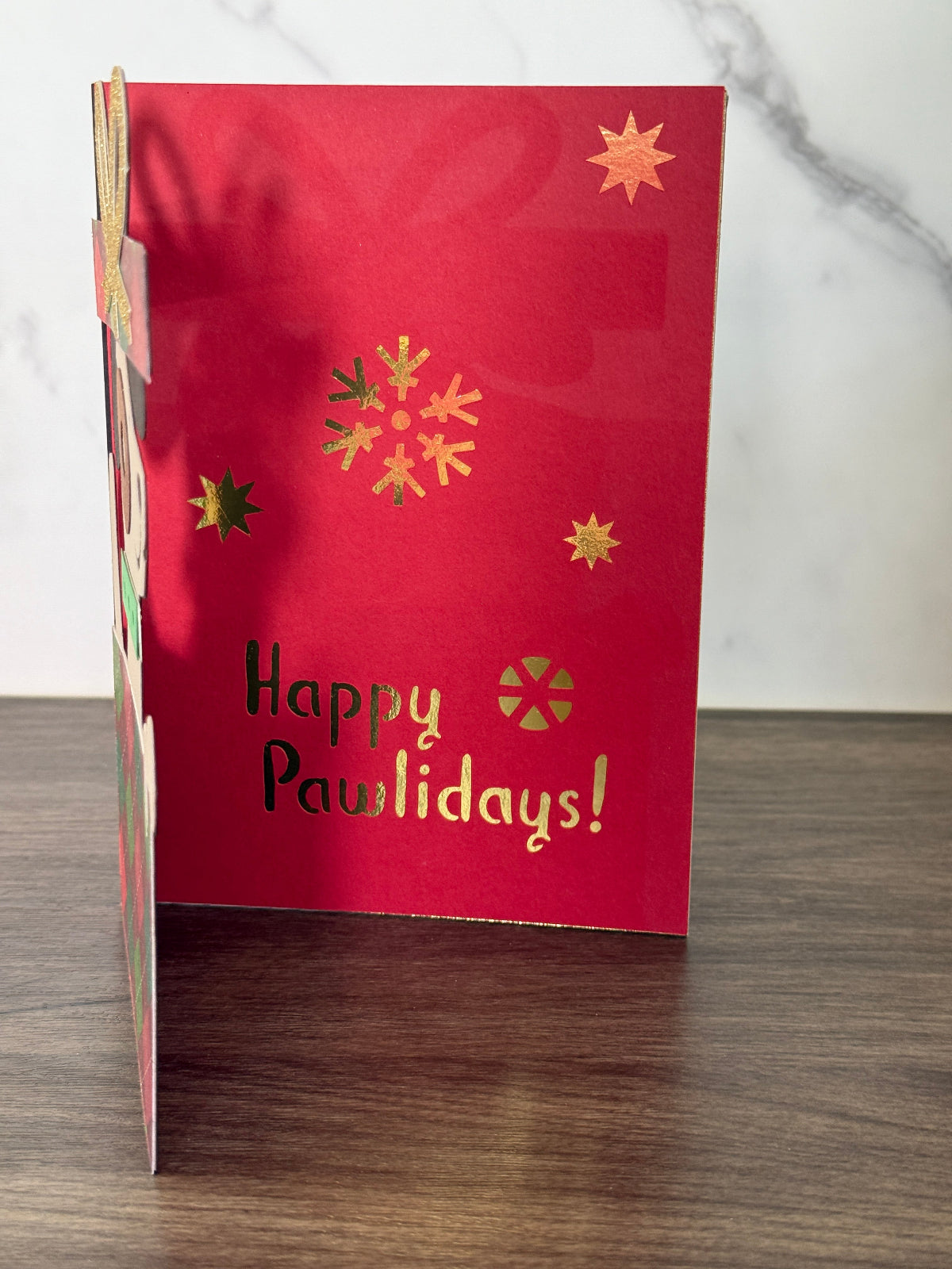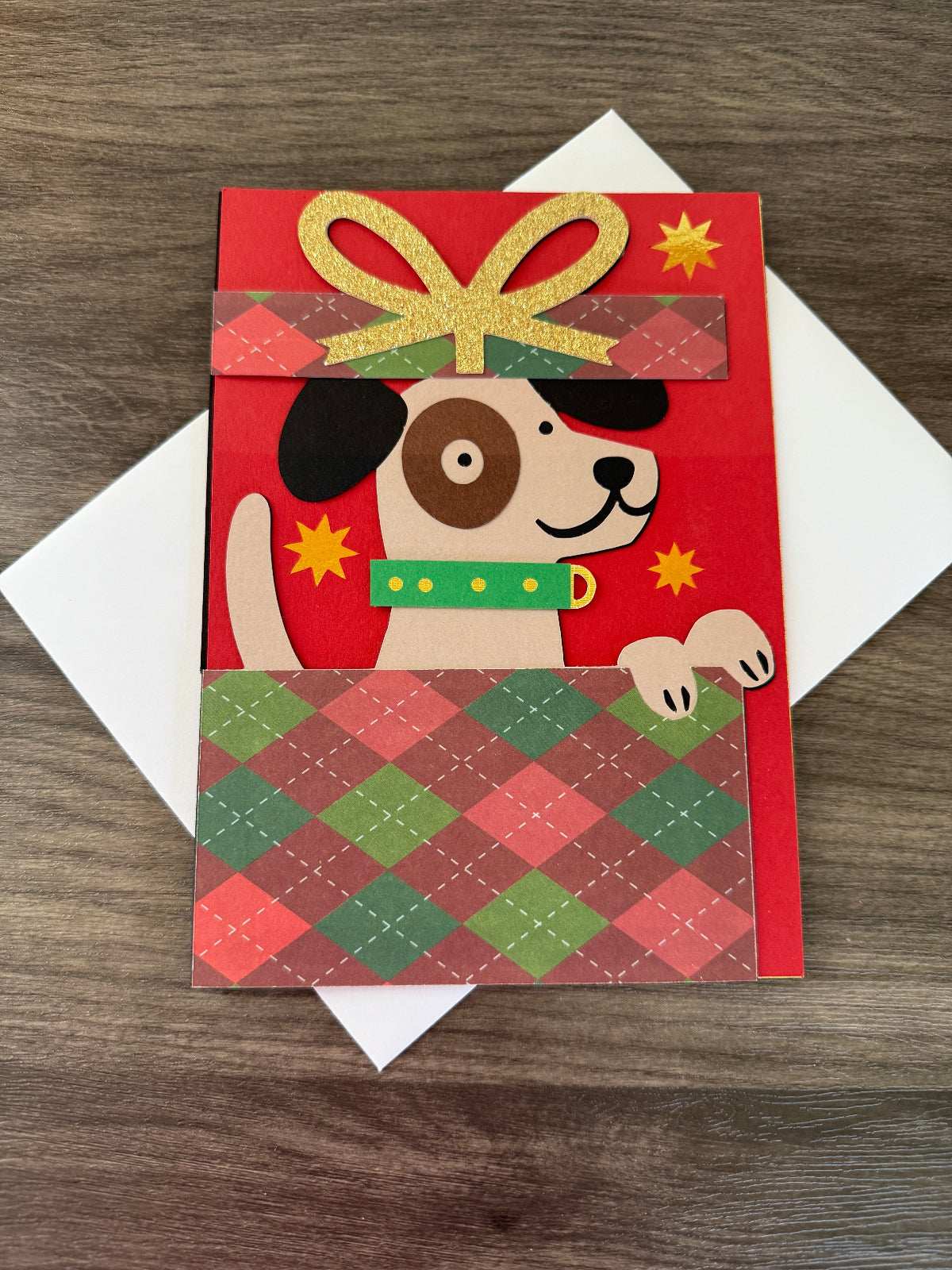This handmade Christmas card bursts with festive joy, featuring an adorable puppy popping out of a patterned gift box. The red background is accented with golden stars, while a sparkling gold bow tops the present for extra holiday sparkle. The pup, complete with a green collar, adds a heartwarming and playful touch. Perfect for dog lovers, this card captures the excitement of Christmas morning and is sure to bring smiles and cheer to everyone who receives it.