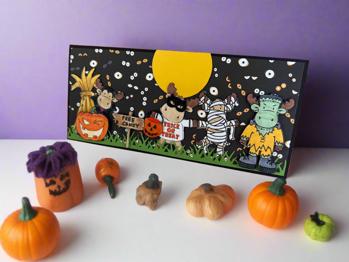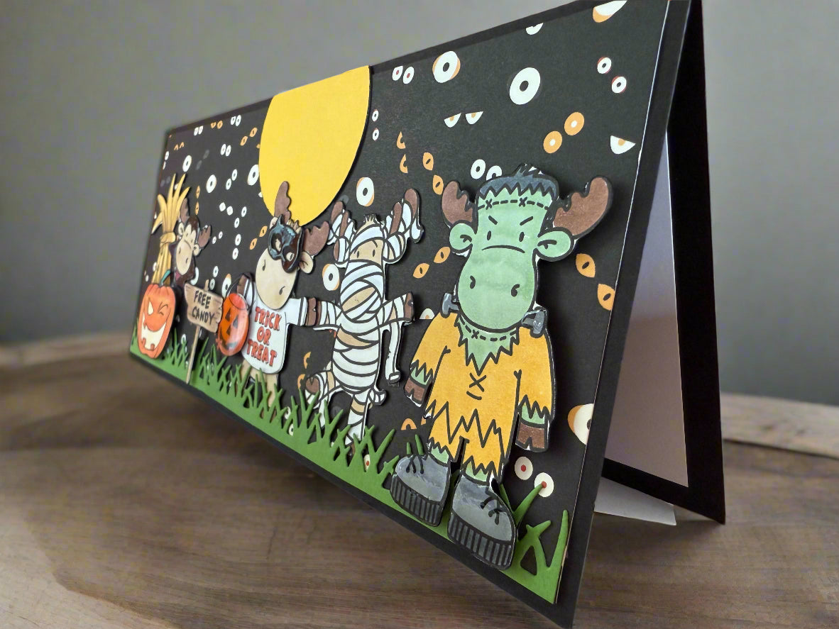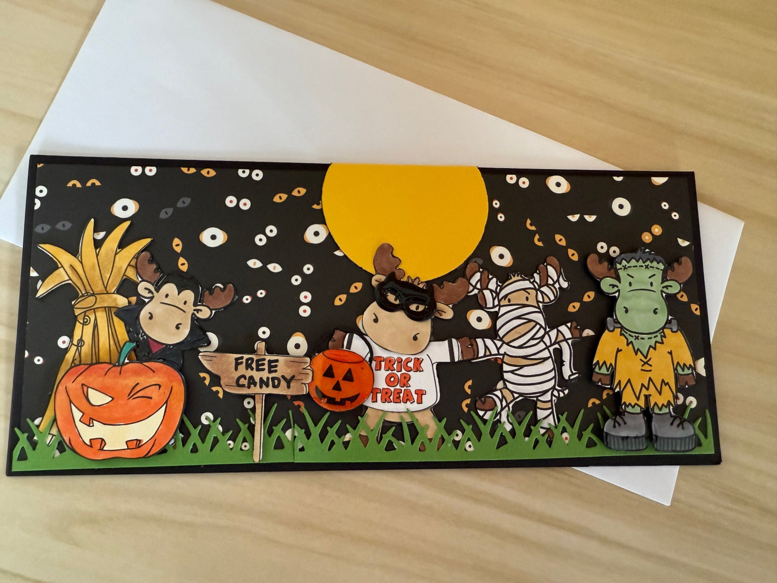 This handmade Halloween card is packed with playful spookiness, featuring a lineup of adorable moose dressed in classic costumes: a caped vampire, a masked trick-or-treater, a toilet-paper-wrapped mummy, and a green Frankenstein. They stand on a grassy patch under a glowing yellow moon, with a winking jack-o’-lantern, cornstalks, and a “Free Candy” sign adding to the festive scene. The background is dotted with glowing cartoon eyes, giving the perfect mix of cute and creepy. Ideal for sending Halloween cheer to friends, family, or anyone who loves a little moose magic.