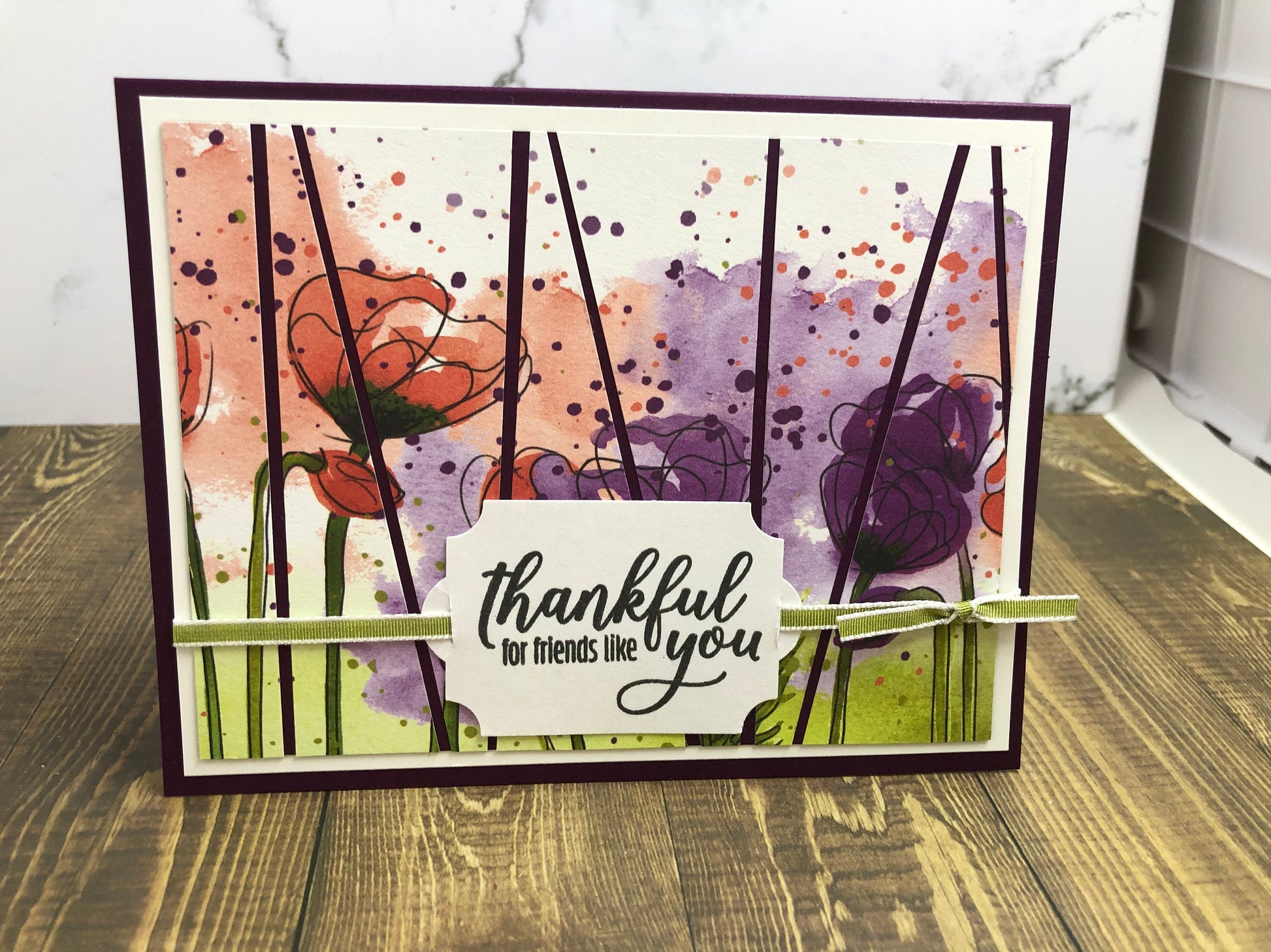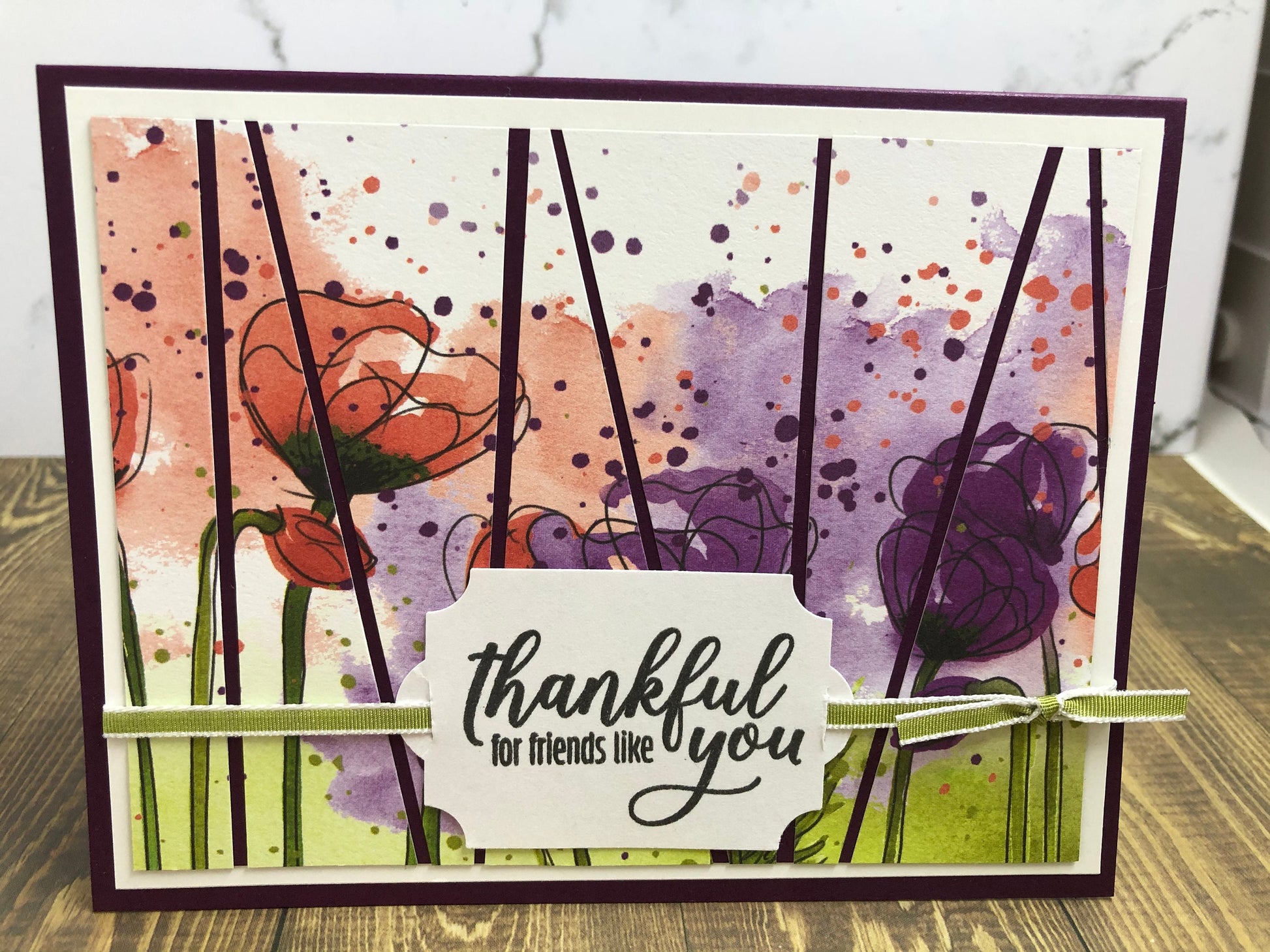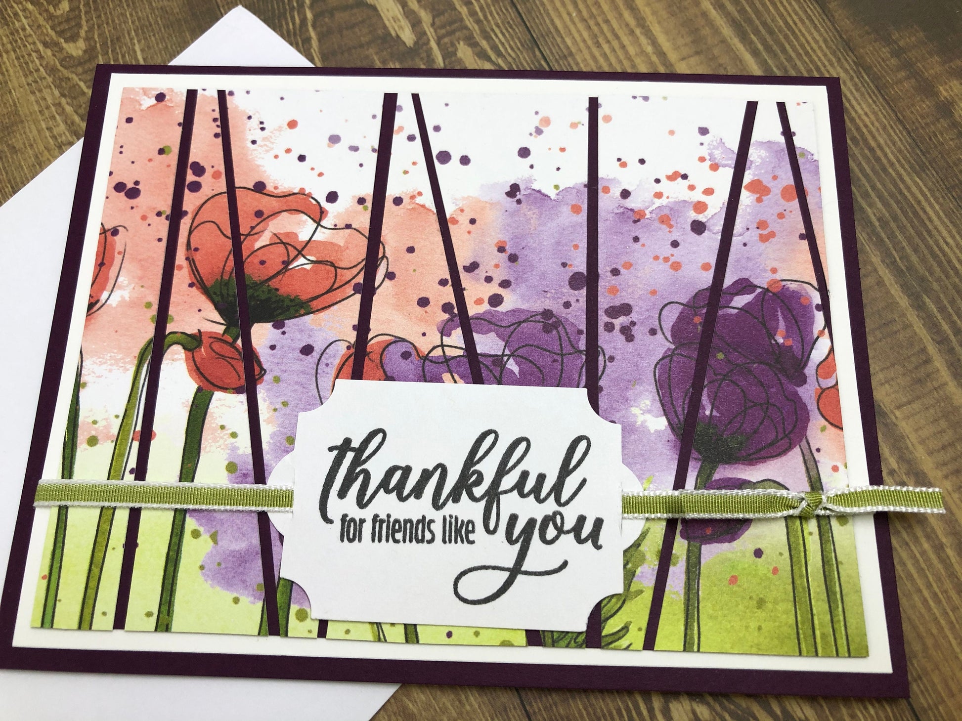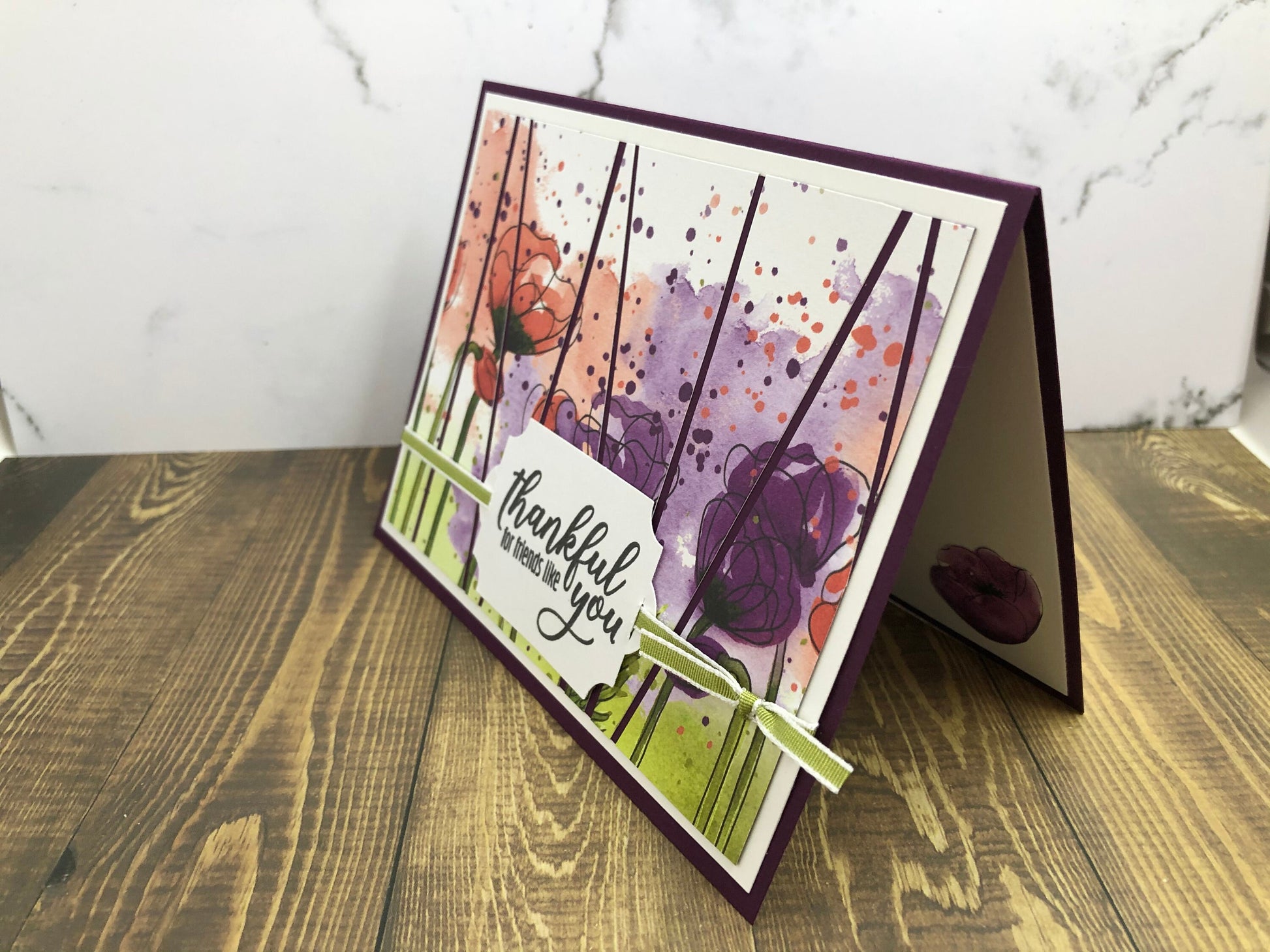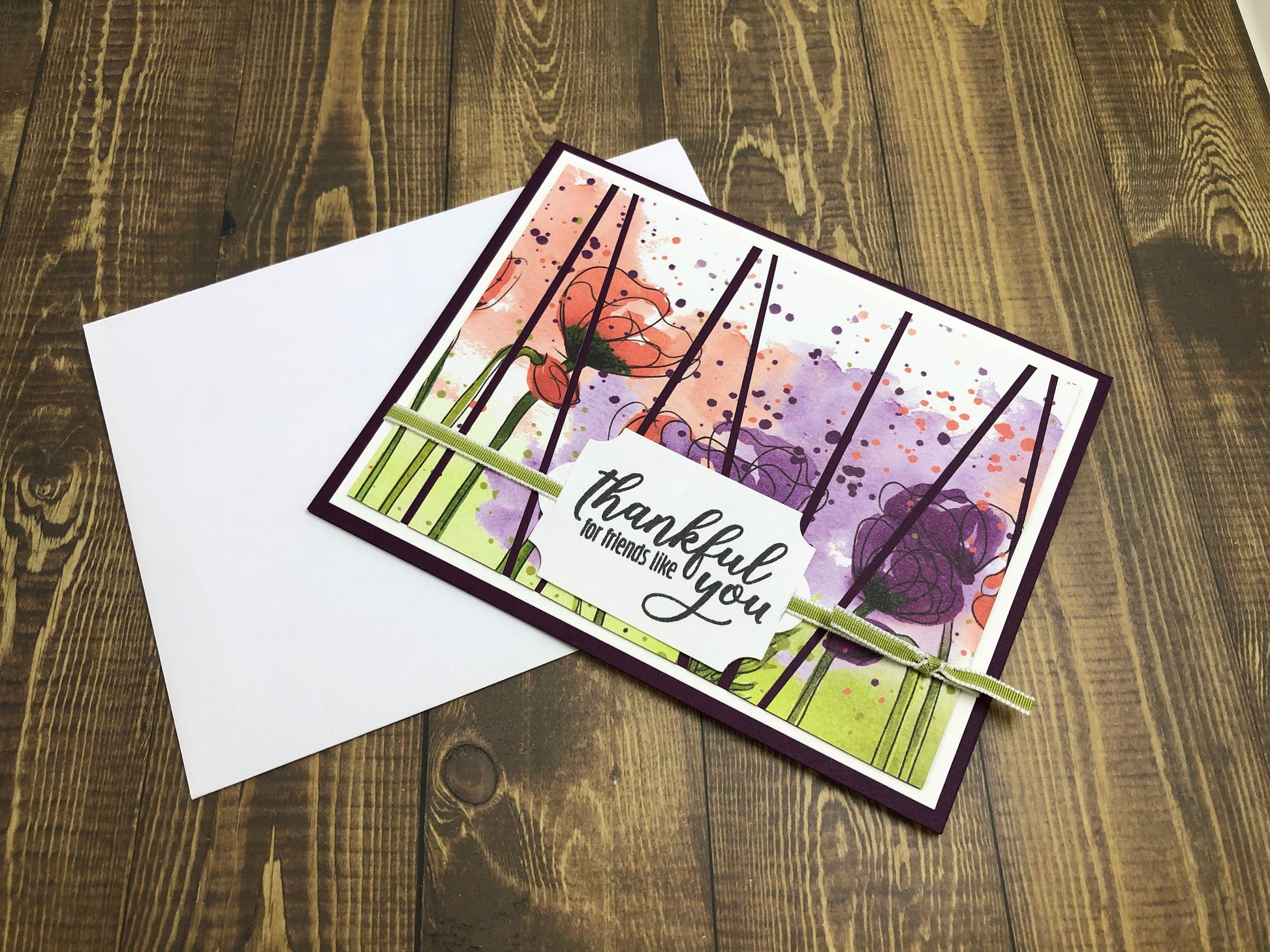 This beautiful watercolor-like card is achieved with patterned paper. "Thankful for friends like you" tag is attached to the front with a green ribbon. Send a special thank you to someone in your life. They will love receiving this card!